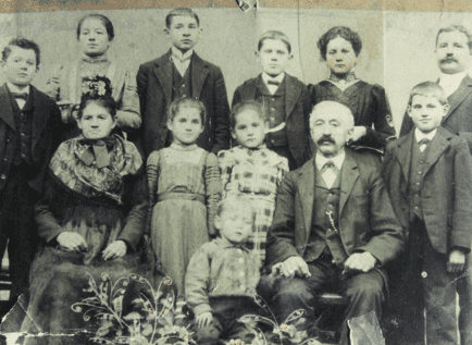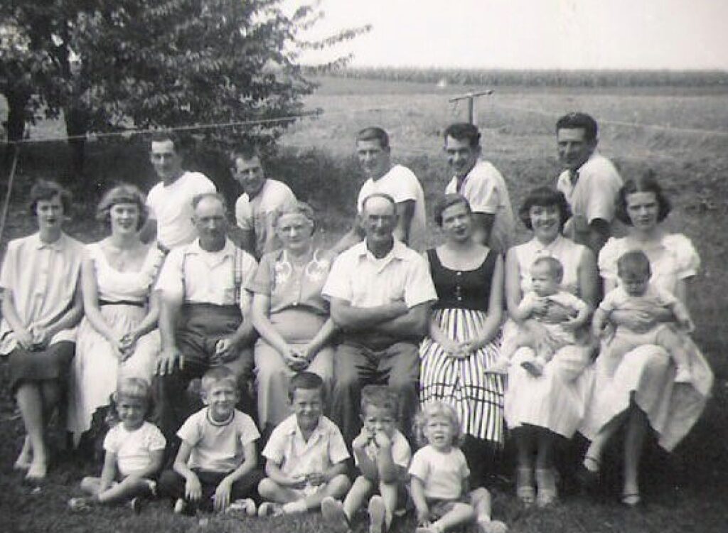 The Beck Family, gathered for a family portrait. Seated (left to right): Monika, Magdalena, Theresia, Jakob, and Albert. Standing (left to right): Jakob Jr., Faran (half-sister), Franz, Wilhelm, Rosa, and Josef (half-brother). Josef’s child sits in the foreground.