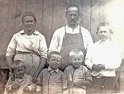 Schmieder Family Photograph — first row (left to right): George Jr., Hilda, Fred, and Arnold; second row (left to right): Benny Feist (hired hand), Albert Beck (Rosa’s brother), Rosa Schmieder, Paul, George Schmieder, and Max Rauscher (friend) - circa 1928
