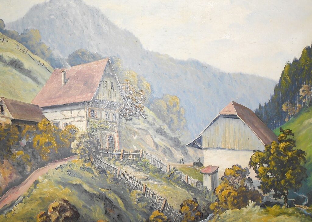 A painting of the Rosa Beck-Schmieder family ancestral home. This traditional Black Forest farmhouse is located near the ruins of Hohengeroldseck Castle on Schönberg hill in Germany.