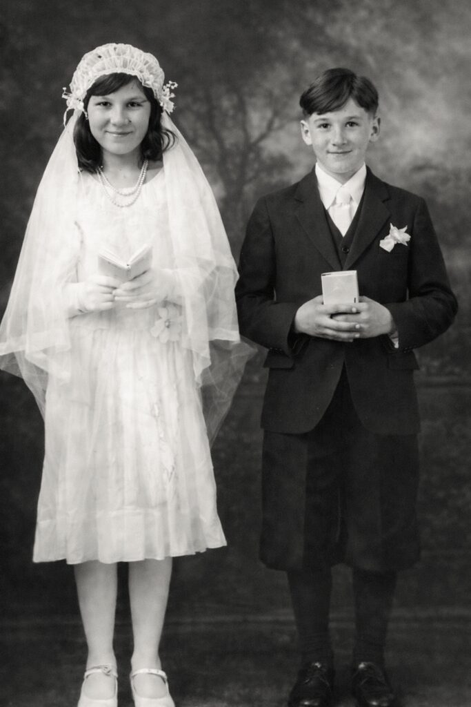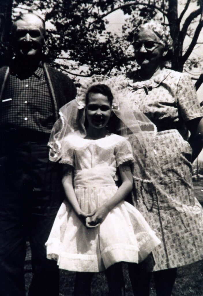 Mary Schmieder (daughter of Paul and Betty Schmieder) on her First Communion with her grandparents, George and Rosa Schmieder, 1962.