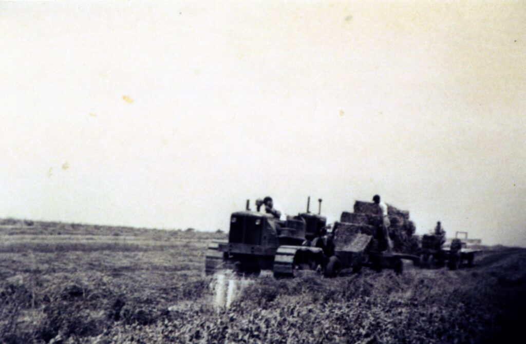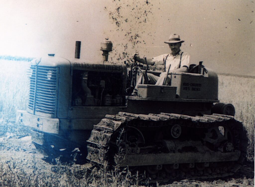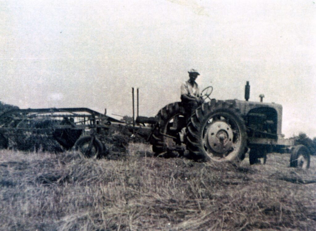 Fred Schmieder (son of George and Rosa) baling hay on the Schmieder farm, Alexander, New York, circa late 1940s.