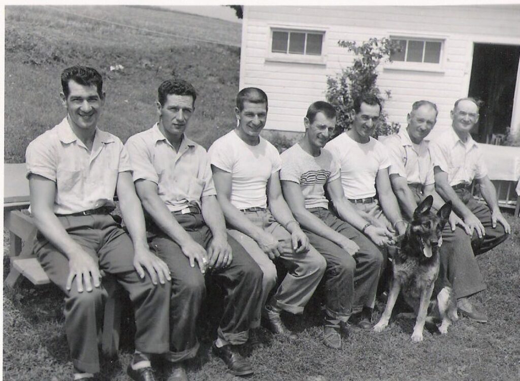 Left to right: Herbie, Paul, George, Arnold, and Fred, with Paul Schmieder (George Schmieder Sr.’s brother) and George Schmieder, Sr. The family’s German Shepherd, Nora, stands nearby. 1954