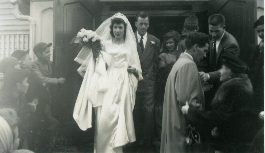 Wedding photograph of Betty Calkins and Paul Schmieder, 1948, with Paul’s brothers Fred (left) and Arnold (right).