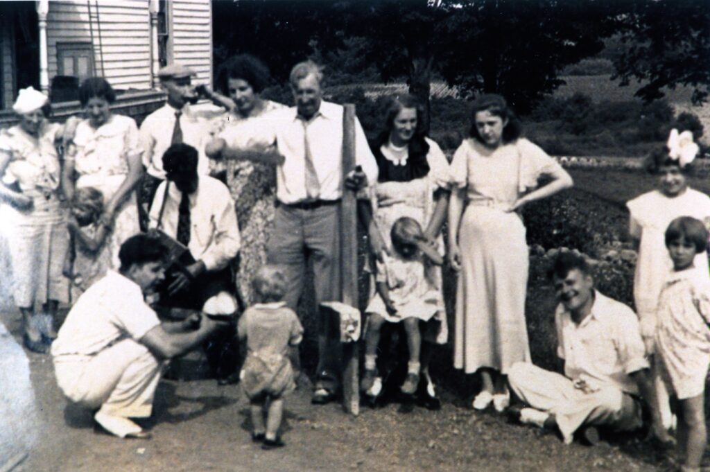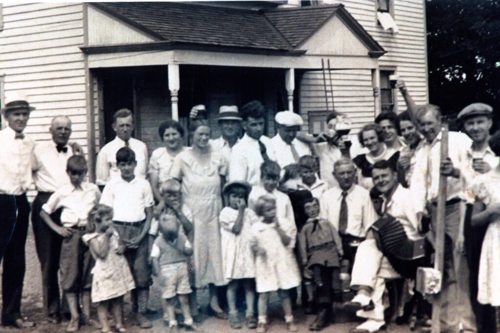 Schmieder family and friends gathered for a celebration at the Schmieder Homestead, Alexander, New York, mid-1930s