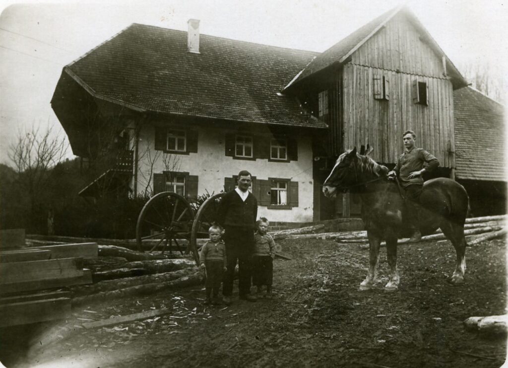 Xaver Schmieder with his children at the Zipperhof, the Schmieder family homestead in Reichenbach, Germany, mid-1940s; Franz Schmieder is shown on horseback.
