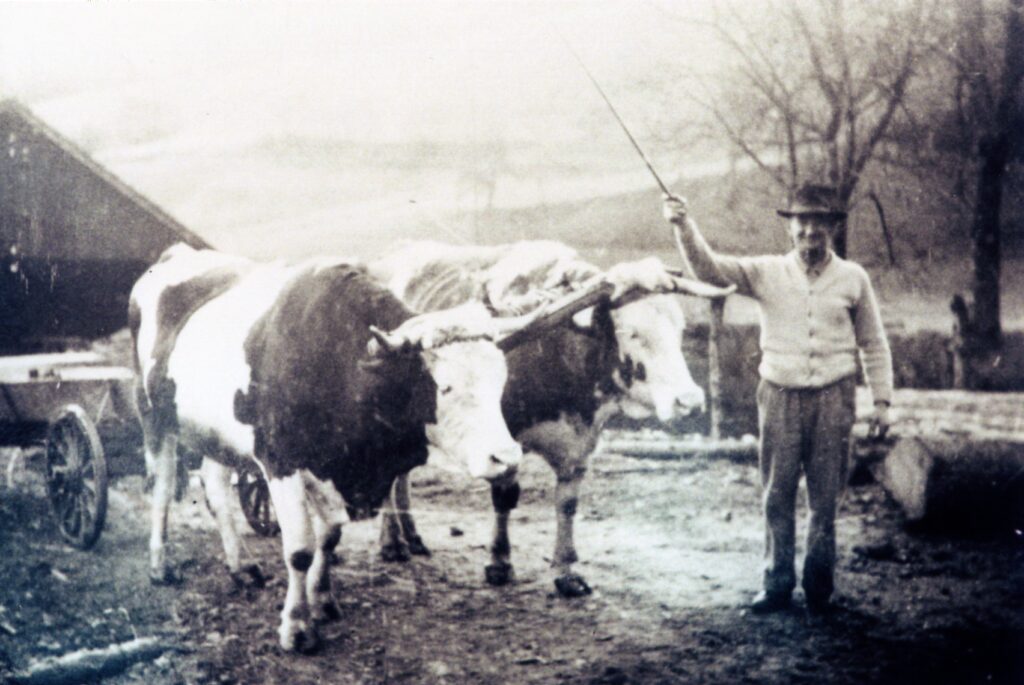 George Schmieder with oxen during a visit to the Zipperhof (Schmieder homestead), Reichenbach, Germany, 1949.