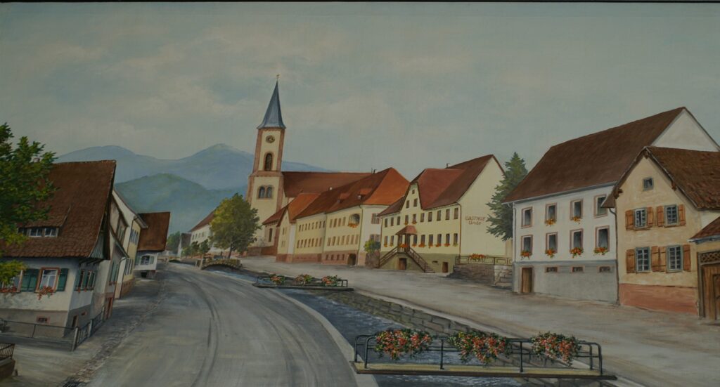 Painting of the village of Reichenbach, Germany, and St. Stephen’s Church—the home parish of the Schmieder and Beck families.